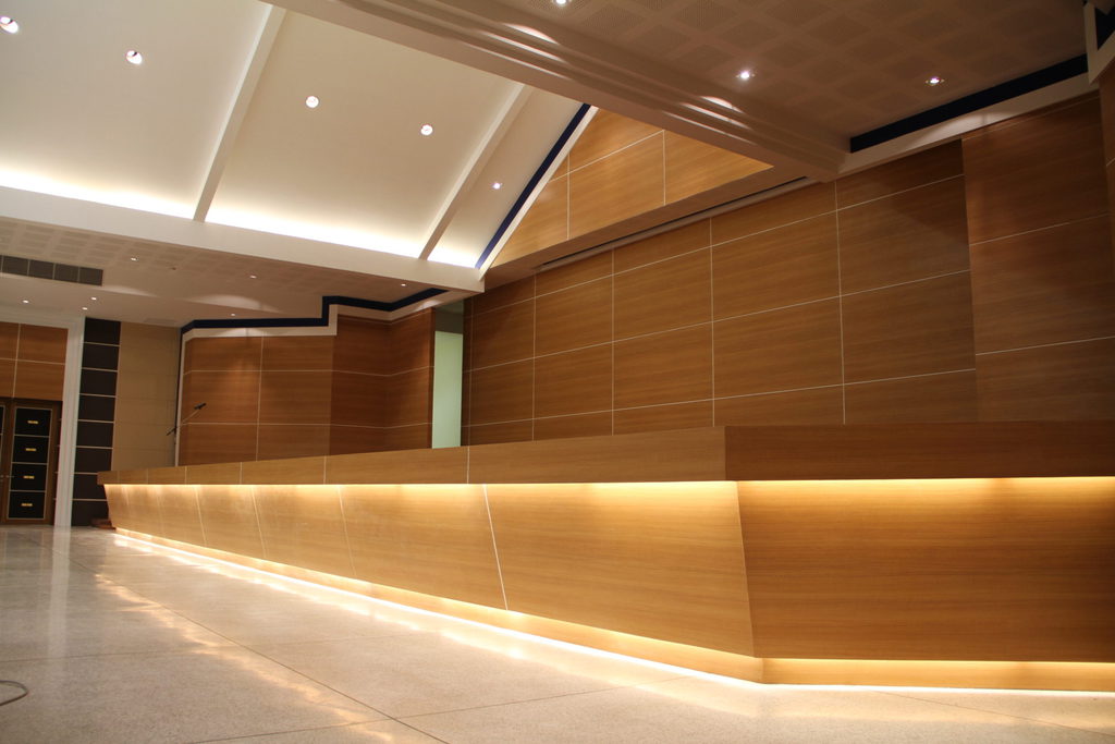 สำหรับโถงต้อนรับและทางเดินด้านหน้าห้องประชุม ได้รับการออกแบบให้กลมกลืนกับงานตกแต่งภายใน ปรับใช้ธรรมชาติมาร่วมในการออกแบบ โดยช่องผนังทางเดินสามารถมองเห็นธรรมชาติและบรรยากาศภายนอกอาคารได้